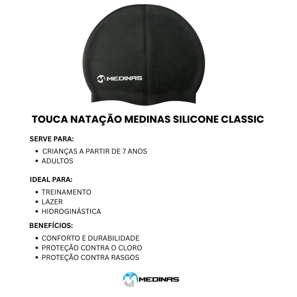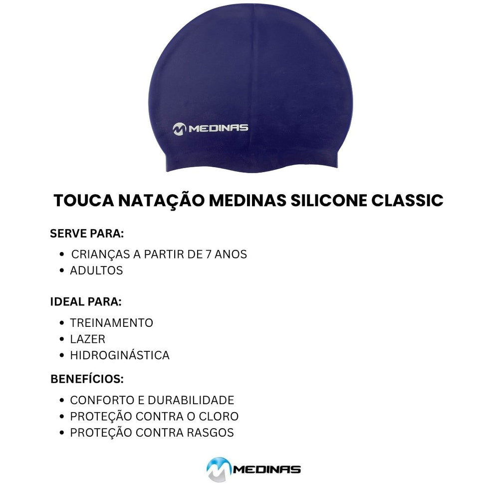 A Touca de Natação Silicone Medinas Classic é ideal para quem treina regularmente e quer proteção eficaz com conforto ao longo das braçadas. Produzida com silicone resistente, ela oferece excelente durabilidade, adaptação para diferentes tamanhos — de crianças a partir dos 7 anos até adultos — e segurança contra rasgos e desgaste com o uso.